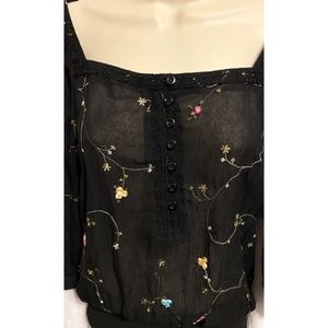 From Romy Collection - Sheer Black Crinkle Blouse with embroidered wildflowers. Excellent Condition. Quarter length sleeves accented with unique layered cuffs. Same layered effect on bottom wide hem which is elastic in the back and fits tighter than the upper blouse. Sized as XS but fit me as a Small.