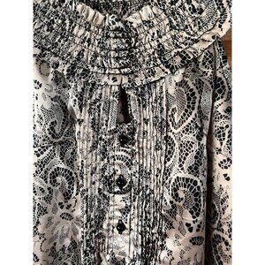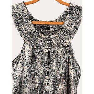 Romy Smocked Pintuck Paisley Floral Print Satin Blouse Button Black Tan XS