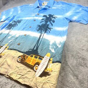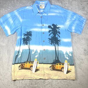 Ron Chereskin Hawaiian Rayon Shirt XL Blue Palm Trees Surf Cars Retro Beach