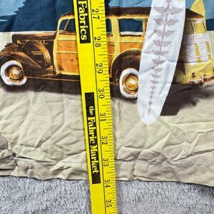 Vibrant vintage-style Hawaiian button-up shirt by Ron Chereskin. Features palm trees, surfboards, and retro woodie cars against a beach backdrop. Lightweight 100% rayon fabric — soft and breathable for casual wear or vacation vibes.