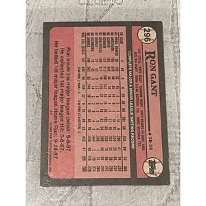 This is a 1989 Topps #296 trading card featuring Ron Gant of the Atlanta Braves. This baseball card is from the 1989 MLB season. It is a non-autographed, non-rookie card manufactured by Topps.