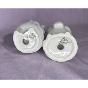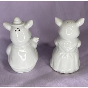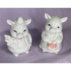 This product is a set of two small ceramic salt and pepper shakers in the shape of white pigs, measuring 3 inches in height with a 2-inch diameter. Created by Ron Gorden in Japan, they feature stoppers and weigh 6 oz. Perfect for adding charm to any occasion, these Mr & Mrs Pig shakers are a delightful addition to any kitchen or collection.