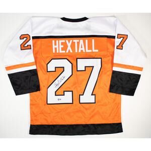 Autographed Philadelphia Flyers Ron Hextall #27 custom hockey jersey, signed in black marker on the back number and authenticated by Beckett (BAS) with matching hologram. High-quality custom fan jersey in Flyers colors with stitched name and numbers. Excellent collectible for Flyers or goalie fans.
