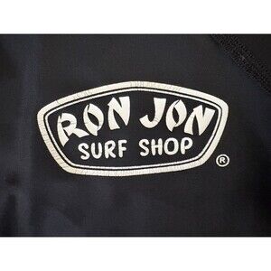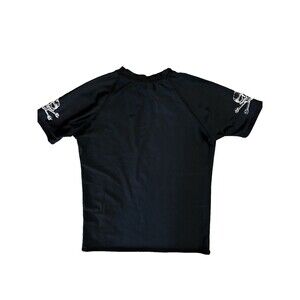 Ron John Surf Shop boys Short Sleeve Rash Guard Surf Shirt Swim Shirt, size 14, black with white logo & skull decals, made in the USA.