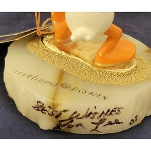 A whimsical treasure awaits with this Ron Lee sculpture, showcasing Disney's beloved Donald Duck in a striking pose. This limited edition figurine, numbered 1118 out of 2000, captures Donald in his classic sailor suit, complete with vibrant blue jacket and cap, standing atop a unique onyx base. The base is signed by Ron Lee and dated 2003, adding a personal touch to this collectible piece. The gold-tone accents around Donald's feet add a touch of elegance and highlight the craftsmanship. This charming sculpture is perfect for adding a touch of Disney magic to a collector's display, brightening up a child's room, or serving as a unique and thoughtful gift for a Disney enthusiast.