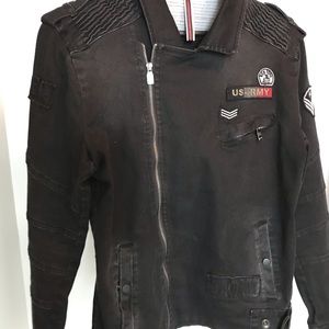 Cool worn looking black/gray washed asymmetrical military style denim jacket with stretch to it making it super soft and comfortable.
