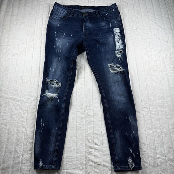 Ron Tomson Logo Graphic Distressed Jeans Men 34x30 Slim Straight Stretch Luxury