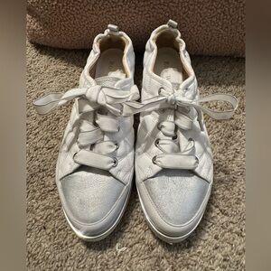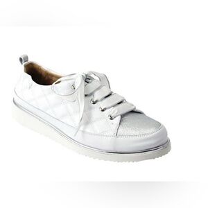 Metallic shimmer at the toe, counter and welt glams up an ultracomfortable quilted-leather sneaker set on a lightweight wedge and finished with ribbon laces. 1 1/4" heel; 3/4" platform Cushioned footbed Leather upper and lining/rubber sole Made in Italy