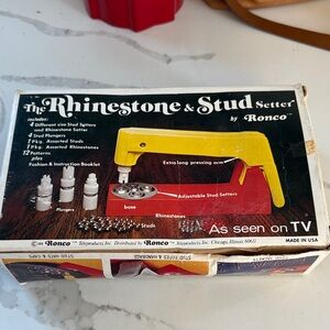 Ronco rhinestone and stud setter kit with yellow tool. Includes assorted studs and rhinestones.