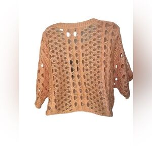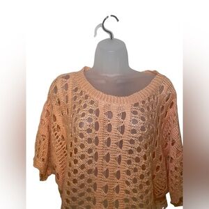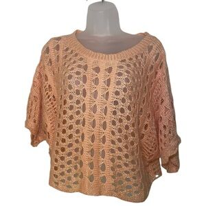 Rondina NY New Pointelle Open Knit Sweater in a beautiful blush orange shade. Features a relaxed, slouchy silhouette with wide sleeves and open knit detailing — perfect as a lightweight layering piece. Size XS/S, fits slightly oversized. New with tags, never worn. Please note: this is a sample item and does not include a care or fabric content tag.