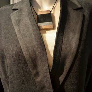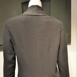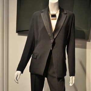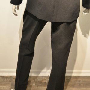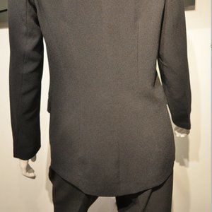 Fall forward in RONEN CHEN’S very perfect lean and lanky soft suiting. Ease galore with modern shape and lines. Gutsy but still very liquid crepe gives chic shape to this SUIT. Pockets and LAPEL are trimmed is a “suede cloth” Very distinctive.