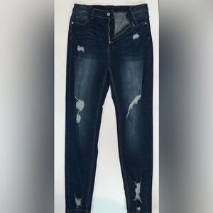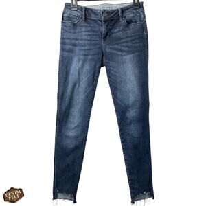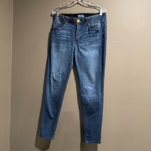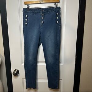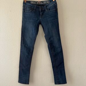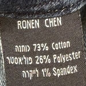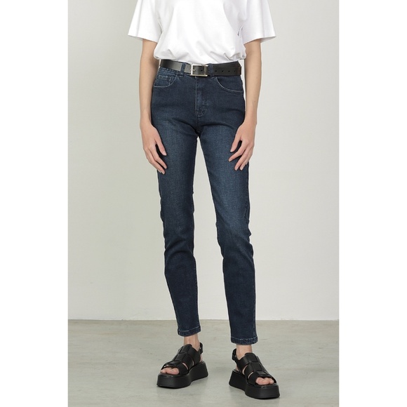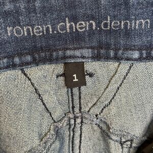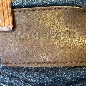 Ronen Chen Denim Front & Back Pockets Zip Front Single Button Closure Mid Rise Belt Loops Vintage Indigo Wash Soft Stretch Skinny Leg Jeans