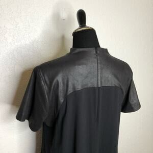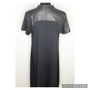 Ronen Chen black faux leather top shift midi dress. Mock collar. Faux leather collar shoulders and sleeves. Short sleeves. Double side pockets. Zips in back. Size 4 or US 12. Excellent preowned condition. Minor wash wear.