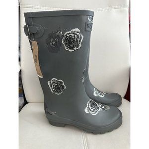 Rongee Women's Rubber Rain Boots Gray Rose Floral Tall Adjustable Buckle SZ 10