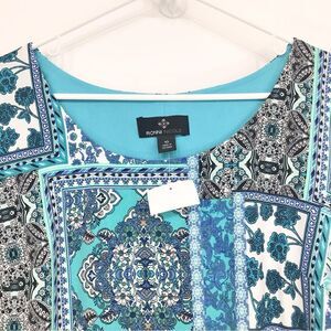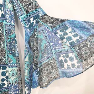 Ronni Nicole Blue Patchwork Floral Tapestry Print Bell Sleeve Sheath Dress