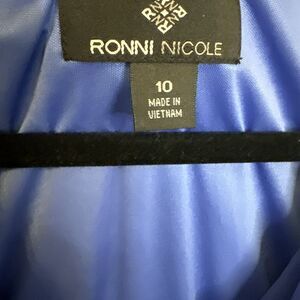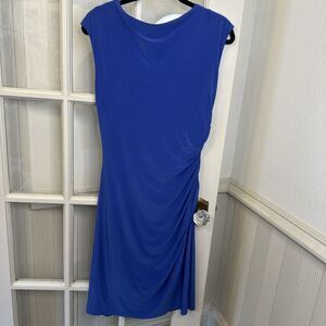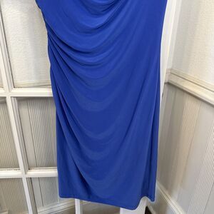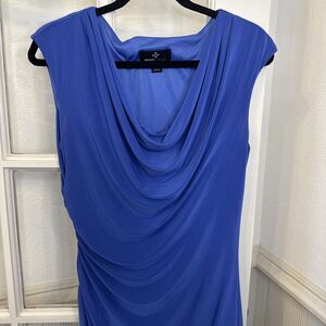 Ronni Nicole Dress Blue Draped Neck Ruched Side Sheath Womens 10