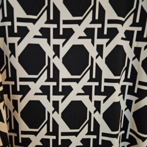 This stunning Ronni Nicole dress features a bold black-and-cream geometric pattern, a flattering scoop neckline, and short sleeves. The stretch knit fabric smooths and flatters, making it perfect for the office, dinner, or a night out.