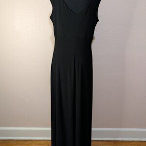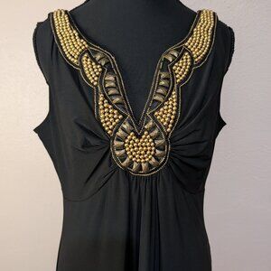 Keywords: Maxi dress, evening gown, floor length, black dress, beaded neckline, gold embellishment, v-neck, formal wear, sleeveless, cocktail dress, elegant, size 12, pleated, draped, wedding guest, holiday party, gala, vintage style, bohemian, chic, slimming, fluid fabric.