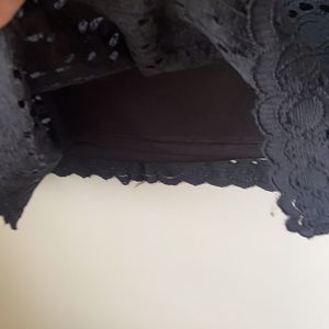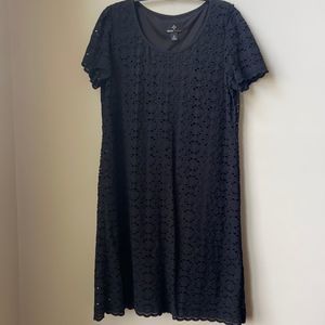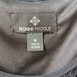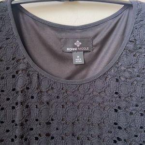 Ronni Nicole Black Lacey Short Sleeve Midi Dress Size Medium Great pre-owned condition Features: round neck, black, lined, nylon, spandex,