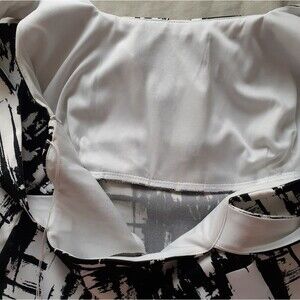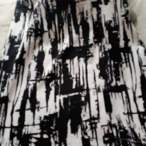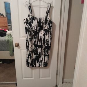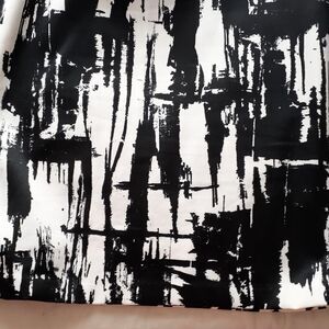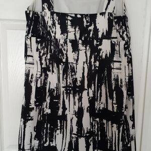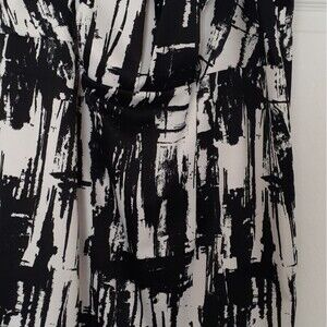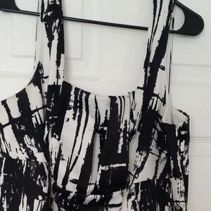 the Ronnie Nicole dress with its square neckline, sleeveless design, and abstract print is a versatile and stylish choice for those who appreciate modern and artistic. Some yellowing on inside hem, not noticeable when wearing. Approximately 21" Arm pit to armpit. Length 40 ".