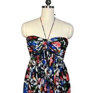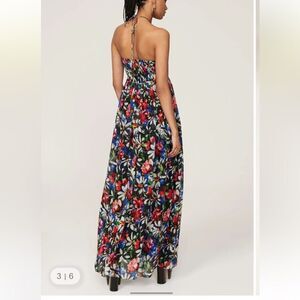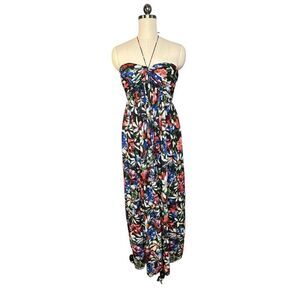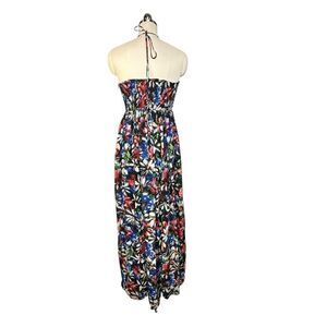 Black floral chiffon halter maxi dress. Wear strapless or with neck tie. Empire waist, fully lined smocked back, side zipper.