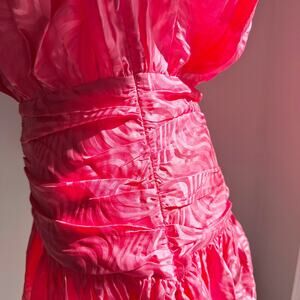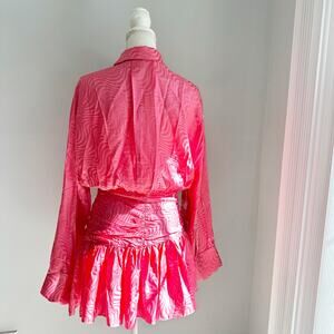 Ronny Kobo Brenda Dress Ria Pink Silk Blend Mini Ruched Waist Size M NWT. Ronny Kobo Brenda Dress in Ria Pink. This stunning designer dress features a shiny satin jacquard swirl pattern, long sleeves with flared cuffs, and a fitted ruched waist that flatters your shape. The flowy mini skirt and structured collar add modern sophistication with a touch of vintage flair. Ships fast, completely smoke free environment.