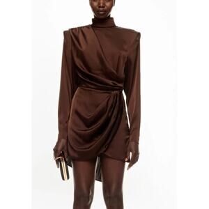 Ronny Kobo Brown Ruched Satin Mockneck Mini Dress XL Cocktail Chic Designer $600
