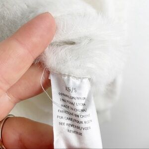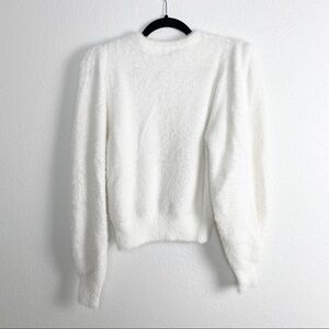 Mid-weight fuzzy knit, puff balloon long sleeves, crew neck, ribbed knit hem, nylon spandex blend. White. Soft, casual, work, warm, soft, lounge, neutral.
