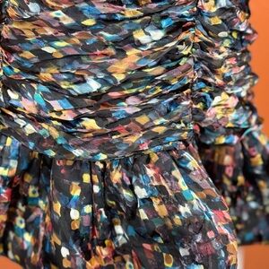 Chic long sleeve dress with vibrant multicolor pattern. Features a stylish ruched design and a flattering fit dress in good condition