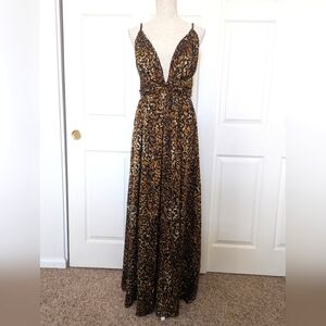 Step out in style with this stunning leopard print maxi dress. Perfect for any occasion, this dress combines elegance with a touch of wild flair. The brown tones add a sophisticated edge to your wardrobe. Plunge neck, shirred banded waist. Left side seam zipper. Shell: 67% viscose, 33% polyester. Lining: 100% polyester. Dry clean only