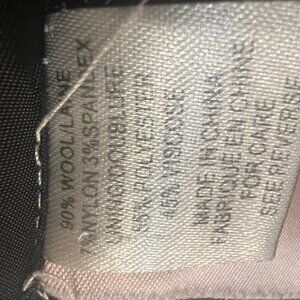 Fabric: Wool-blend woven twill (approx. 90% wool with added stretch)