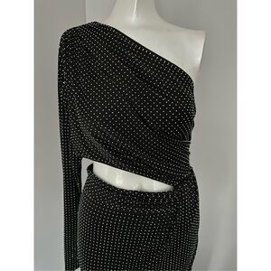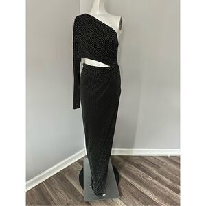 Ronny Kobo's Lorinna gown features mini metallic dots and a one-shoulder silhouette. This piece is finished with a daring thigh-high skirt slit and a bodice cut out.