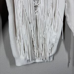 Ronny Kobo Open Stitch Fringe Sweater Cream Lace Up Crew Neck Long Sleeves
