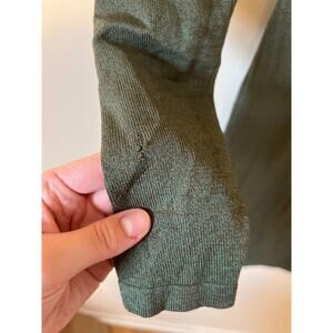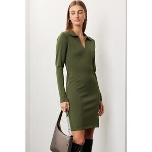 Green knit (60% Viscose, 40% Cotton). Sweater sheath. Long sleeves. V-neck. Pull on. Polo collar. Mini length.