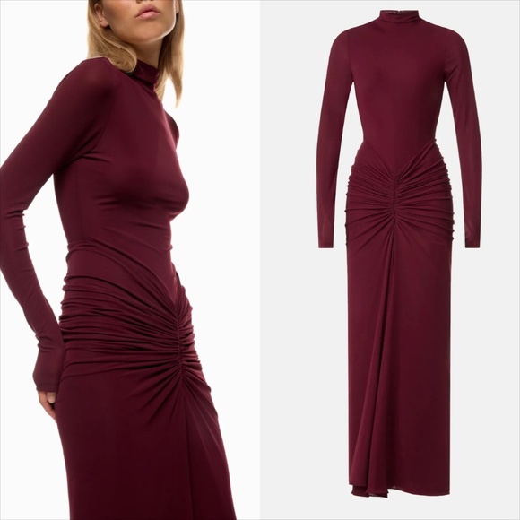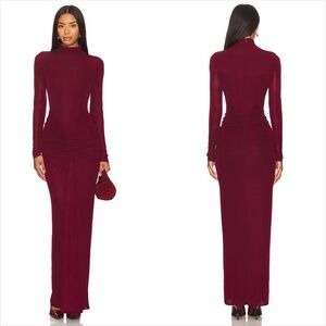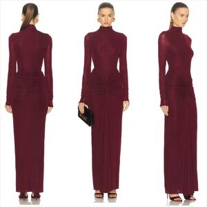 Ronny Kobo scorpio mock neck ruched mesh jersey burgundy maxi dress