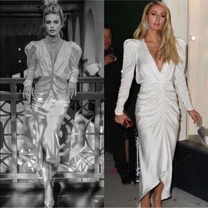 Ronny Kobo Astrid V-Neck Long-Puff-Sleeve Sequin Asymmetric Midi Dress