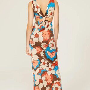 Bright and oversized blooms bring a fun, retro edge to this Ronny Kobo maxi dress complete with waist cutouts and a scoop back.