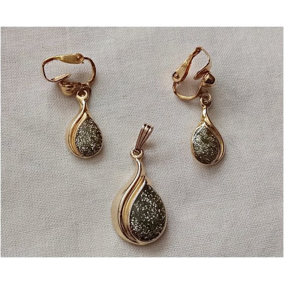 This stunning jewelry set from Ronté / Ronte of Beverly Hills is a perfect addition to any collection. The set includes a pendant, and clip-on earrings, all in a beautiful gold color with white/colorless diamond dust.