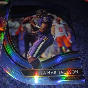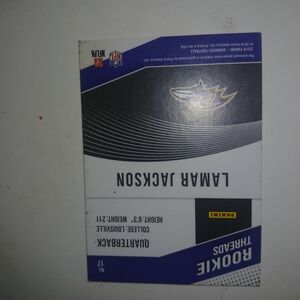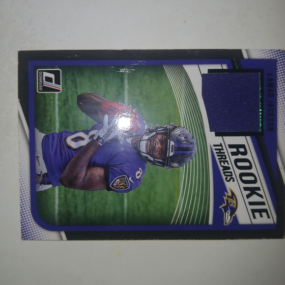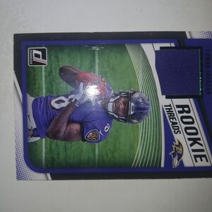 Rookie Threads football card featuring a player in a purple jersey. Includes a patch detail.