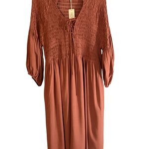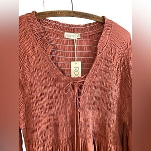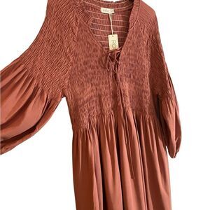 New with Tags salmon colored dress by Roolee. Ruched bodice for an easy fit. Tie lace neckline. Balloon sleeves.