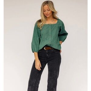 The Highland Falls Button Blouse features a square neckline, functional buttons, and textured material. With the most beautiful green color, this blouse is the perfect choice for all your spring get-togethers.