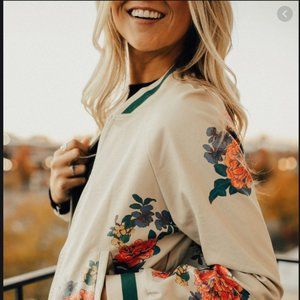 A really cute and comfortable faux leather bomber jacket with floral design!