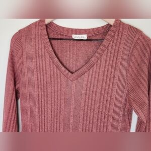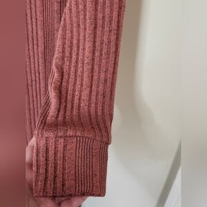 Heathered mauvy color, cuffed sleeves, v-neck, 96% polyester, 4% elastane
