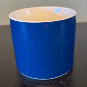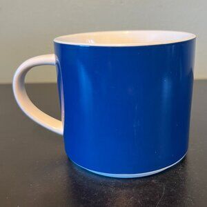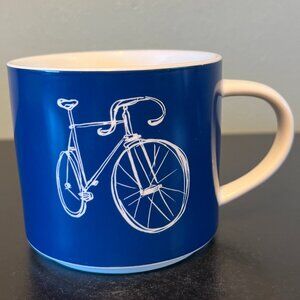 Room Essentials porcelain mug features a white image of a bicycle against a royal blue background. White interior and handle. Microwave and dishwasher safe. Measures 3.5” tall with a 3.75” diameter; 5.25” across including the handle. Holds 16 fluid oz.