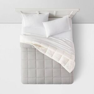 Escape to your dreamland in cozy comfort with the Sherpa Washed Microfiber Comforter from Room Essentials. Boasting a super-soft, washed quilted fabric on one side and plush sherpa on the other side, this microfiber comforter feels soft against your skin and helps keep you cozy all night. Featuring a dual-hue design with white sherpa at the reverse and a solid quilted front, this sherpa comforter instantly enlivens your sleeping space. Simply coordinate it with a matching sham, contrasting sheets and fluffy pillows to transform any bedroom in your home into a cozy and colorful relaxing haven.