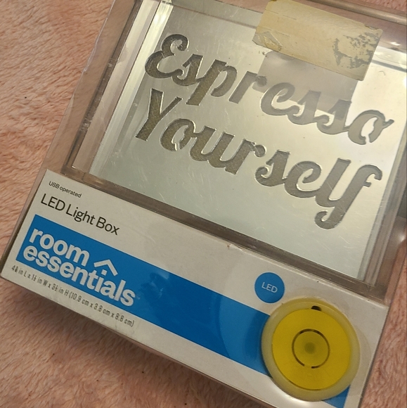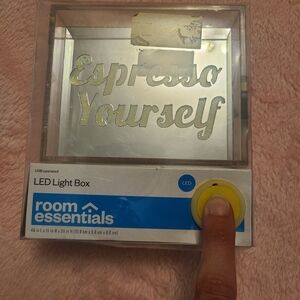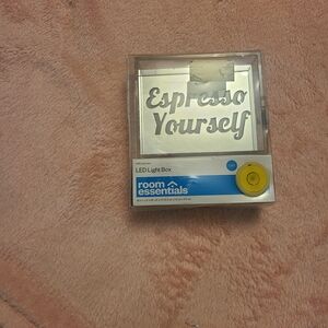 Room Essentials LED light box with 'Espresso Yourself' design. Features a yellow button.