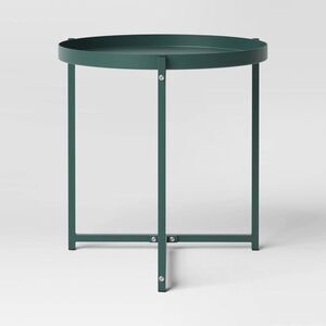 Upgrade your outdoor living with this Tray Top Metal Accent Table from Room Essentials. Ideal for resting your favorite drink, book or potted succulent, this patio accent table features a rounded structure with a tray top design that is fixed in place on a sleek and solid metal base. The all-weather finish allows for use season after season, and the solid color frame coordinates with any decor. Place it next to your outdoor sofa, chaise lounger or in between your favorite outdoor chairs.Room Essentials: Everyday Value