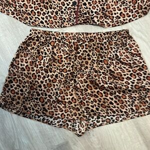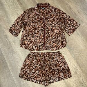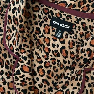 Adorable Room Service 2 piece animal print pj set. Purple trim and a button front.