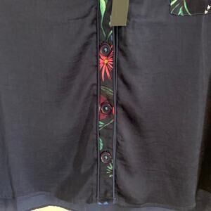 Super cute and comfy button down short sleeve top from Room Service. Navy blue with floral contrast/trim/pocket. Polyester, machine wash
