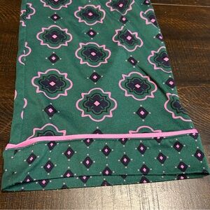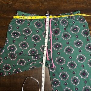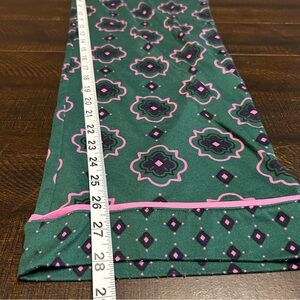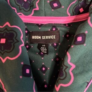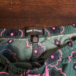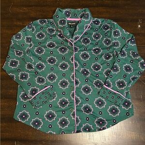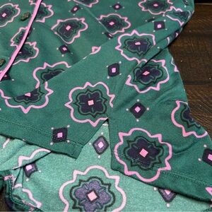 Cozy green pajama set with a purple geometric pattern. Perfect for relaxing at home.
